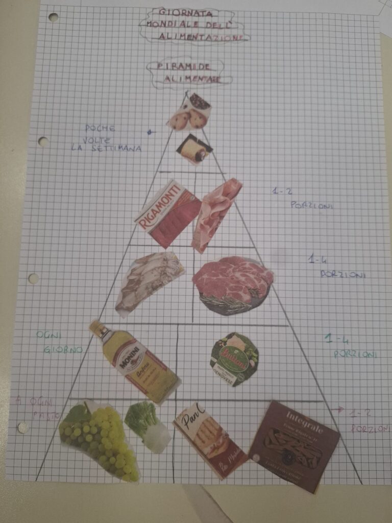 In occasione della Giornata Mondiale dell’Alimentazione, i ragazzi di classe quinta hanno partecipato con entusiasmo a un’attività dedicata alla corretta alimentazione, realizzando un colorato cartellone raffigurante i vari alimenti suddivisi secondo la piramide alimentare.